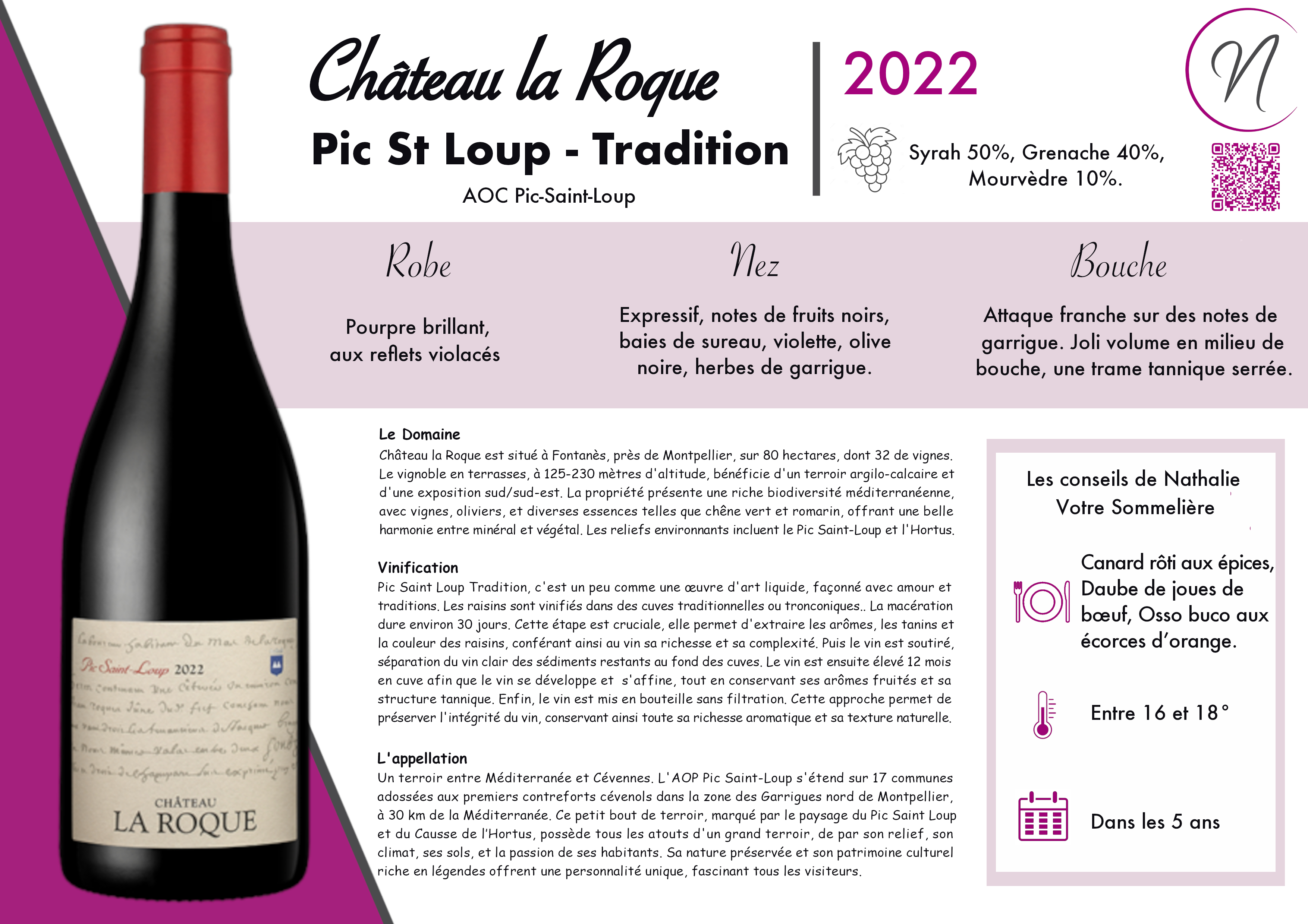 La cuvée Pic Saint Loup Tradition du Château La Roque est le fruit d’un assemblage méticuleusement équilibré de Syrah (50 %), Grenache (40 %) et Mourvèdre (10 %). Ces cépages s'harmonisent pour créer un vin à la fois riche et complexe. Ils offrent une profondeur gustative unique.